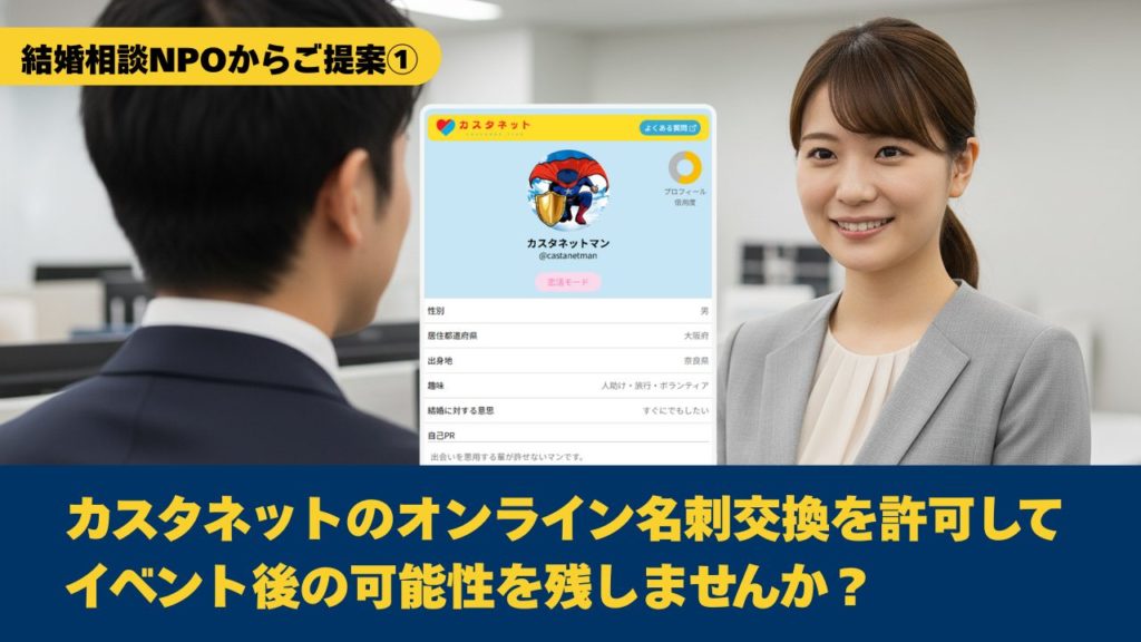 ユーザー様からは「自治体婚活と組むべき」というご提案をまずいただき、続いて「カスタネットのオンライン名刺はそういったイベントでこそ力を発揮する」とまでご進言いただきました。